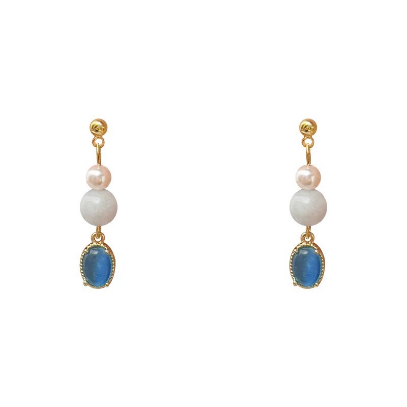 925純銀 海藍色 貓眼石貝珍珠 垂墜耳環耳針-金 防抗過敏 無耳洞可改夾