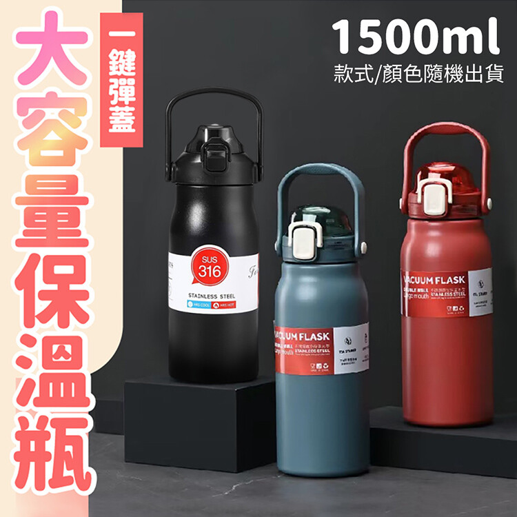 手提大容量一鍵彈蓋316保溫瓶1500ml 可提保溫杯 健身保溫壺 大容量水壺 運動水壺戶外便攜水壺