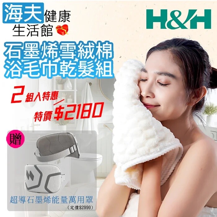◆ 限時特賣 石墨烯雪絨棉浴毛巾乾髮組(加贈超導石墨烯能量萬用罩)