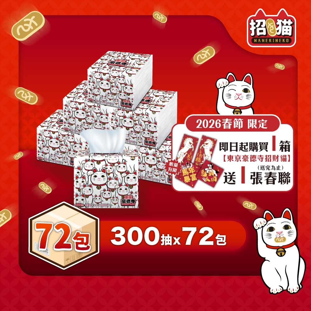 【東京豪德寺】招き猫日式單抽式柔拭紙巾/萬用紙巾輕巧包300抽72包/箱