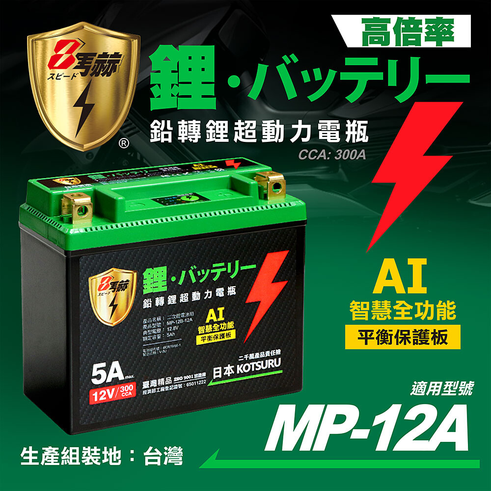 8馬赫機車鉛轉鋰動力電瓶,生產組裝臺灣,ISO 9001廠,企業以綠能、減碳、永續、責任為目標,生產超高倍率電池,採用最新研發奈米高倍率電芯、能量密度高、重量最輕、電力強勁、啟動電流最強;容量大,使用時間長,為最強悍的綠色能源。