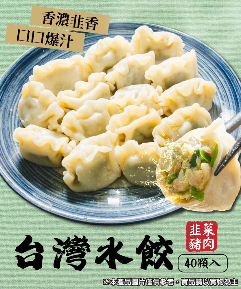方案1 4入 售價$585 均價$147 方案2 6入 售價$820 均價$137 方案3 8入 售價$999 均價$125 商品介紹🥟 台灣韭菜豬肉水餃(40粒/包)