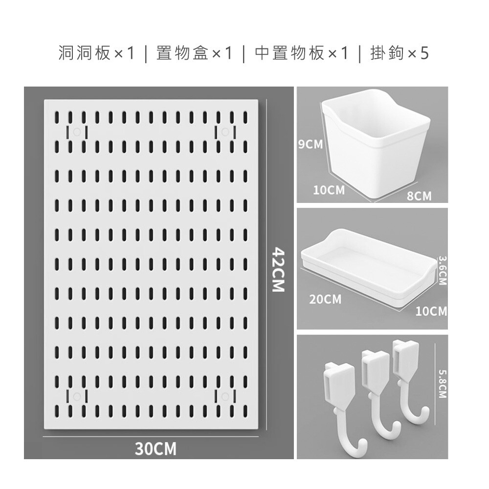 組合配件內容:30x42cm洞洞板×1、 置物盒x1、20cm置物板x1、掛鉤×5
