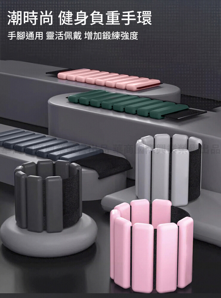 優惠方案方案1 1入 售價$759 均價$759 方案2 2入 售價$1458 均價$729 方案3 4入 售價$2886 均價$722 方案4 8入 售價$5722 均價$716 方案5 16入 售價$11394 均價$713 商品介紹品名:潮時尚健身負重手環-外銷款