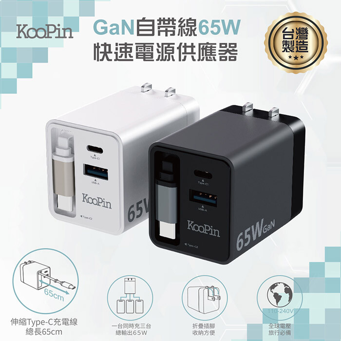 KooPin 台灣製造 65W氮化鎵 自帶Type-C伸縮線 三輸出快速充電器(支援PD、QC快充)