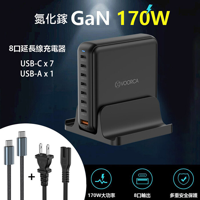 VOORCA 桌面型 8孔170W氮化鎵 1USB-A+7USB-C 快速充電器(內附240w充電線