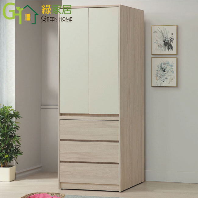 方案1 1入 售價$7262 均價$7262 商品介紹【綠家居】美斯2.7尺二門三抽衣櫃 木紋雙色系+安心材質製造,使用放心+搭配居家更便利,採用防蛀木心板+防潮耐磨底座+五金滑軌結構+防夾手緩衝門片五金等安心材質製造 ,外層採用防潮耐磨噴漆處理搭配採用開門櫃+吊衣桿+三抽屜+內開放層格等收納空間設計,全由專人配送到家,專業安心服務,替你省下更多時間!