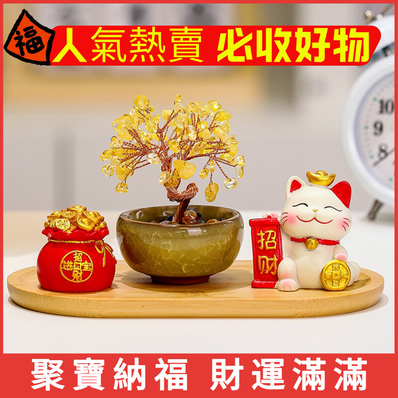- 黃水晶發財樹+聚寶盆+招財貓+竹木托盤