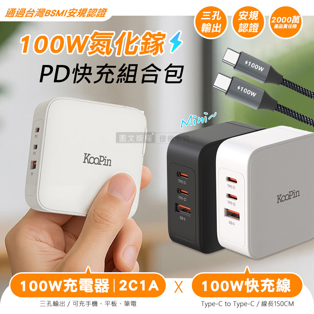 【KooPin】100W 氮化鎵三孔充電器 PD+QC快充頭 支援筆電/手機/平板 附100W編織線