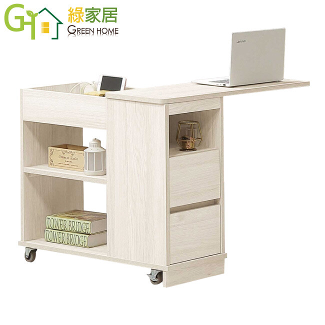 搭配採用桌面板可橫移使用+USB充電插座+二抽屜+開放層格等收納空間設計