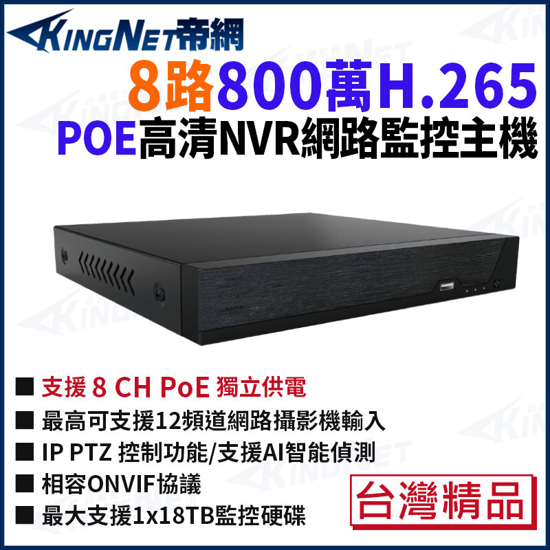 帝網 KingNet 800萬 8路網路監控主機 8路POE 台製 AI智能偵測 NVR 監視器主