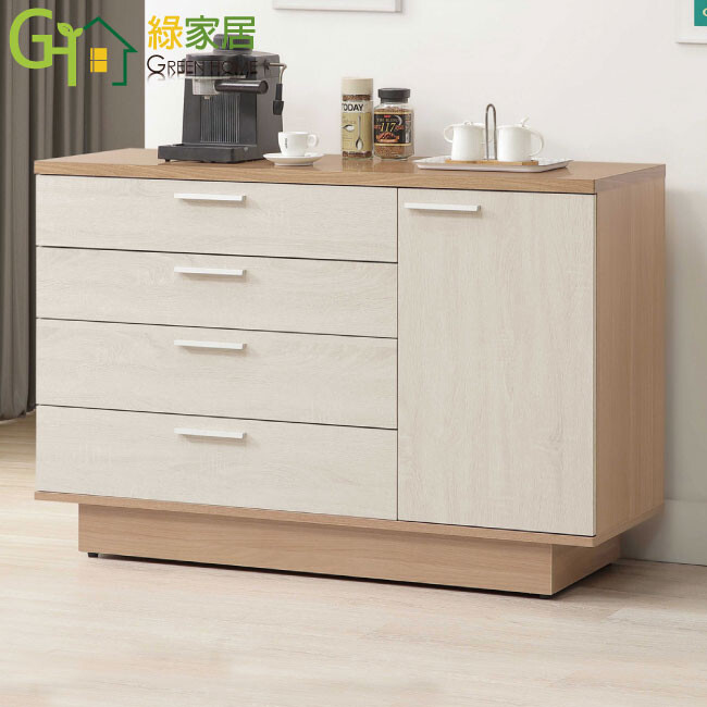 方案1 1入 售價$8810 均價$8810 商品介紹【綠家居】賓利雙色4尺單門四抽餐櫃 木紋雙色系+安心材質製造,使用放心+搭配居家更便利,採用防蛀木心板+防刮耐磨底座+防夾手緩衝門片五金等安心材質製造 ,外層採用防潮耐磨噴漆處理搭配採用開門櫃+四抽屜+內收納層格等收納空間設計,全由專人配送到家,專業安心服務,替你省下更多時間!