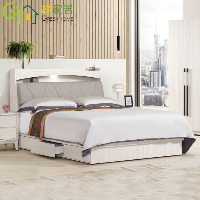 搭配床頭可掀式床枕板+內&外開放層格+LED夜燈設置+床底座單邊開合三抽屜等收納空間設計
