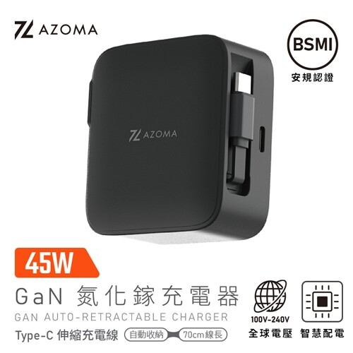 AZOMA GAN14-45W-B 氮化鎵45W帶線充電頭/黑(1C) USB充電器