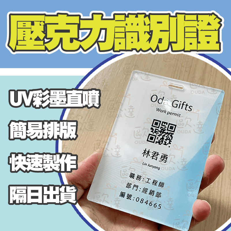 優惠方案方案1 1入 售價$649 均價$649 方案2 2入 售價$1258 均價$629 方案3 5入 售價$2995 均價$599 商品介紹品名:壓克力識別證
