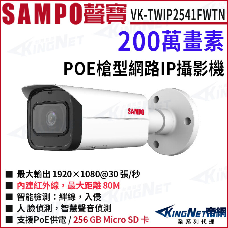 SAMPO 聲寶 VK-TWIP2541FWTN 200萬 槍型網路攝影機 紅外線80米 POE 監