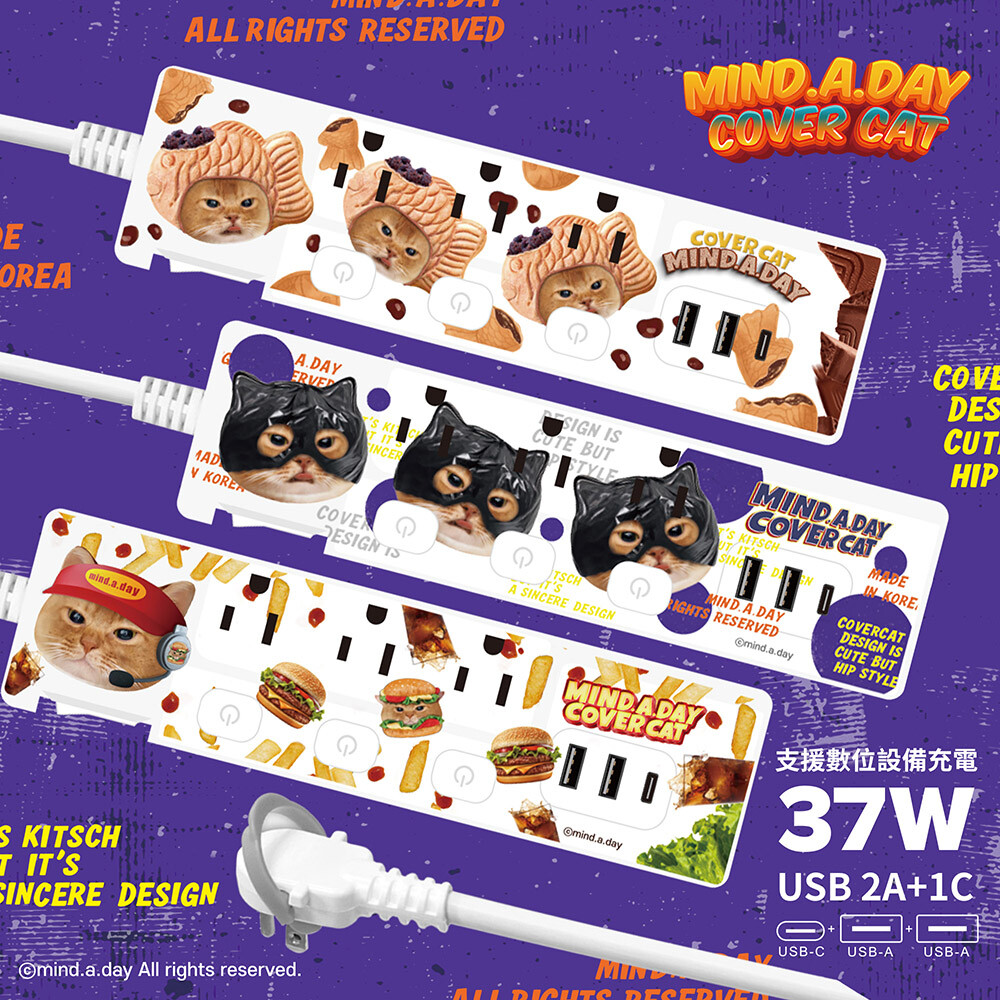 【正版授權】Mind.A.Day貓咪 PD37W平貼式延長線 按壓式4開3插+USB延長線 1.8M