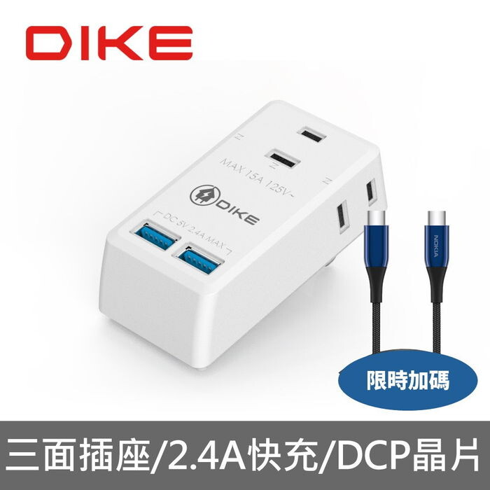 DIKE【DAH832WT-COOL】雙USB2P3座智能快充小壁插DAH832WT排插