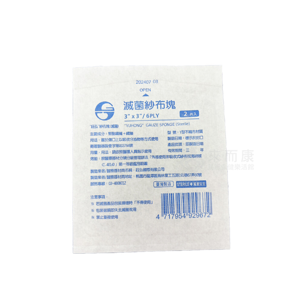 來而康 鈺弘 紗布塊 (滅菌) 3X3 6P Y型 不織布紗布塊 2入/包 1400包/箱 滅菌 紗