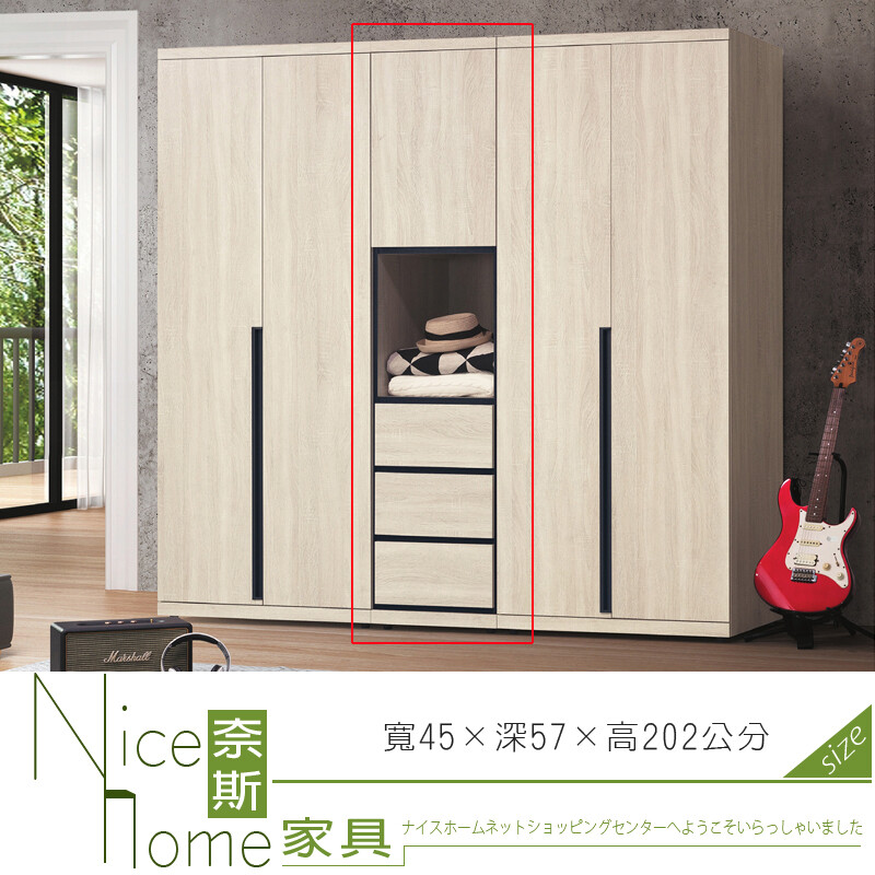 45cm鋼珠兩節式雙開滑軌分類 標籤 尺寸 寬45×深57×高202公分 材質 正面.側面為耐磨木心板