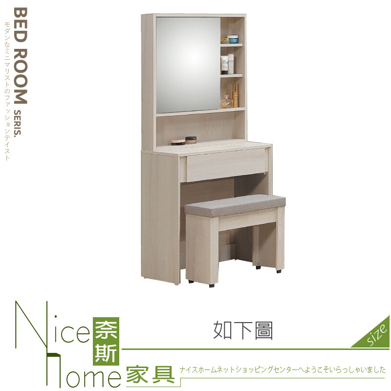TEL: (02)2828-0860 手機 / Line ID:0905-423-752商品評價你可能也會喜歡【綠家居】福瑞 梣木紋2.7尺旋轉式鏡台/化妝台組合(含化妝椅)80305折1人購買12【綠家居】普蓋爾 現代3尺開合式鏡台/化妝台組合(含化妝椅+側邊櫃)117851人購買15《奈斯家具Nice》500-04-HT 吉恩2.6尺鏡台組/含椅106560《奈斯家具Nice》485-04-HG 琴森鏡台/化妝台/含椅92160《奈斯家具Nice》505-04-HT 艾維2.7尺鏡台/化妝台96000《奈斯家具Nice》004-04-HMB 雪松如意化妝台/鏡台/含椅/A00853760《奈斯家具Nice》311-04-HJ 帕特3尺岩板鏡台/化妝台/含椅124800《奈斯家具Nice》646-08-HT 馬克斯2.7尺鏡台/化妝台/含椅87360《奈斯家具Nice》508-04-HT 緹莉2尺鏡台/化妝台89280《奈斯家具Nice》403-04-HT 丘比特碳香橡木鏡台/含椅94080《奈斯家具Nice》606-03-HT 艾佳床頭櫃26880《奈斯家具Nice》310-04-HC 十勝2.7尺鏡台/化妝台/不含椅87360《奈斯家具Nice》184-04-HV E05#淺灰橡2.7尺化妝台/鏡台/含椅95040《奈斯家具Nice》606-05-HT 艾佳六斗櫃78720《奈斯家具Nice》421-04-HG 凱麗鏡台/化妝台101760《奈斯家具Nice》127-04-HM 北海松鏡台/含椅115200《奈斯家具Nice》626-05-HD 羅威化妝台/鏡台/含椅108480《奈斯家具Nice》606-06-HT 艾佳5×7尺衣櫃/衣櫥216960《奈斯家具Nice》606-07-HT 艾佳7×7尺衣櫃/衣櫥276480