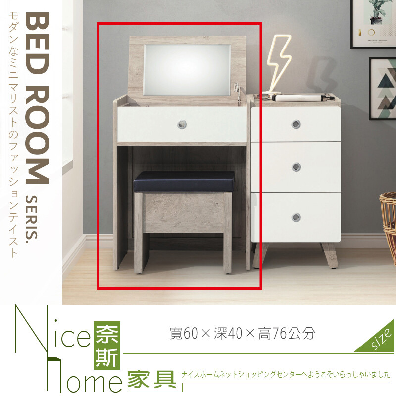 TEL: (02)2828-0860 手機 / Line ID:0905-423-752商品評價你可能也會喜歡《奈斯家具Nice》646-07-HT 馬克斯2尺掀鏡台/化妝台/含椅68160《奈斯家具Nice》510-4-HT 派蒙淺橡木2.7尺掀鏡台/含椅61440《奈斯家具Nice》147-04-HV 玻璃梧桐2.6尺掀鏡台/化妝台/含椅60480《奈斯家具Nice》500-4-HT 派蒙灰橡木2.7尺掀鏡台/含椅61440《奈斯家具Nice》510-4-HT 派蒙淺橡木2.7尺掀鏡台/含椅61440《奈斯家具Nice》412-03-HT 溫蒂4尺斗櫃74880《奈斯家具Nice》124-05-HDC 泰勒2尺多功能掀鏡台/化妝台/含椅82560《奈斯家具Nice》559-04-HDC 萊米克2尺多功能掀鏡台/化妝台83520《奈斯家具Nice》33-4-HK 瑪莉歐3尺掀鏡台/含椅76800《奈斯家具Nice》21-19-HDC 奧蘭多3尺掀鏡台/含椅96000《奈斯家具Nice》17-20-HDC 艾維3尺掀鏡台/含椅117120《奈斯家具Nice》16-20-HDC 喬迪3尺掀鏡台/含椅119040《奈斯家具Nice》655-8-HDC 布拉格2.7尺掀鏡台/含椅82560《奈斯家具Nice》074-04-HP 昆提斯3.3尺掀鏡化妝台/含椅103680《奈斯家具Nice》412-05-HT 溫蒂三抽功能櫃43200《奈斯家具Nice》606-9-HDC 華沙3尺伸縮掀鏡台/含椅111360《奈斯家具Nice》510-4-HDC 安卡拉3尺伸縮掀鏡台/含椅118080《奈斯家具Nice》079-05-HDC 哥本哈根實木3.3尺掀鏡台/含椅142080《奈斯家具Nice》46-9-HC 亞伯特掀鏡台/不含椅66240