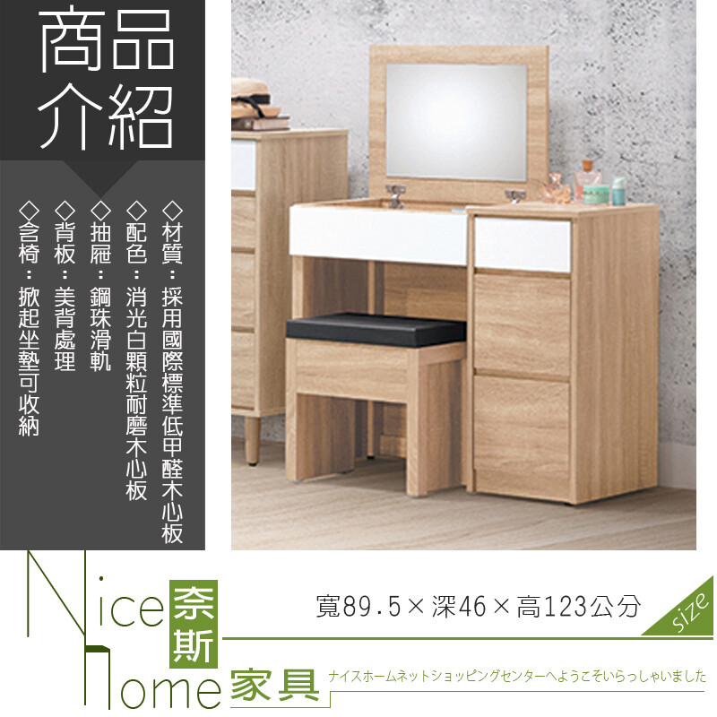 TEL: (02)2828-0860 手機 / Line ID:0905-423-752商品評價你可能也會喜歡日式掀鏡化妝桌附椅 梳妝台 梳妝桌 化妝台 化妝桌 MIT台灣製 |宅貨307126人購買1290日系三抽掀鏡化妝桌(附插座) 梳妝台 梳妝桌 化妝台 化妝桌 上掀鏡書桌 書桌 台灣製|宅貨37438人購買293《C&B》第二代折疊和室掀鏡化妝書桌196831人購買7244《C&B》加寬型英倫風掀鏡兩用化妝書桌椅組305313人購買3109《奈斯家具Nice》33-7-HK 瑪莉歐2.2尺開門鏡台/含椅76800《奈斯家具Nice》33-7-HK 瑪莉歐2.2尺開門鏡台/含椅76800多功能尿布台 床中床 小床 嬰兒換尿布台 洗澡台 按摩台 整理台 嬰兒床1503172人購買27218《奈斯家具Nice》510-4-HDC 安卡拉3尺伸縮掀鏡台/含椅118080《奈斯家具Nice》21-19-HDC 奧蘭多3尺掀鏡台/含椅96000《奈斯家具Nice》17-20-HDC 艾維3尺掀鏡台/含椅117120《奈斯家具Nice》16-20-HDC 喬迪3尺掀鏡台/含椅119040《奈斯家具Nice》606-9-HDC 華沙3尺伸縮掀鏡台/含椅111360《奈斯家具Nice》33-15-HK 瑪莉歐4尺餐櫃62400《奈斯家具Nice》510-4-HT 派蒙淺橡木2.7尺掀鏡台/含椅61440《奈斯家具Nice》500-4-HT 派蒙灰橡木2.7尺掀鏡台/含椅61440《奈斯家具Nice》510-4-HT 派蒙淺橡木2.7尺掀鏡台/含椅61440【LUST】3.5尺 10公分記憶床 全平面/備長炭記憶床墊/3M吸濕排汗-惰性矽膠床(日本原料)台190161人購買2669《奈斯家具Nice》33-3-HK 瑪莉歐四斗櫃58560《奈斯家具Nice》412-04-HT 溫蒂2尺掀鏡台/含椅57600