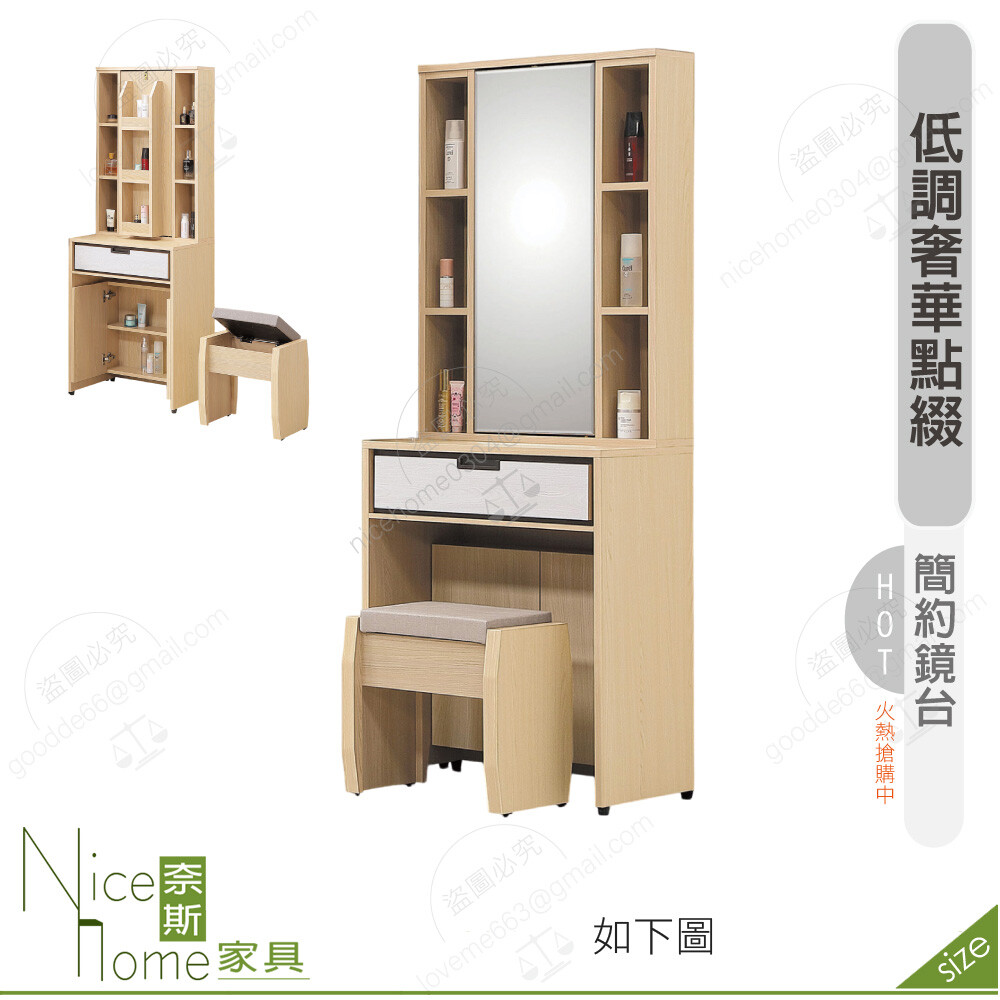 TEL: (02)2828-0860 手機 / Line ID:0905-423-752商品評價你可能也會喜歡【綠家居】福瑞 梣木紋2.7尺旋轉式鏡台/化妝台組合(含化妝椅)80305折1人購買12【綠家居】普蓋爾 現代3尺開合式鏡台/化妝台組合(含化妝椅+側邊櫃)117851人購買15《奈斯家具Nice》503-02-HK 雷克斯2尺掀鏡鏡台/化妝台69120《奈斯家具Nice》081-05-HK 圓圓1.9尺化妝台/鏡台/含椅71040《奈斯家具Nice》013-07-HK 美利亞2.7尺鏡台/含椅90240《奈斯家具Nice》185-07-HV D05#白榆木2.7尺化妝台/鏡台/含椅95040《奈斯家具Nice》144-05-HM 約書亞2尺鏡台/化妝台/含椅64320《奈斯家具Nice》639-03-HDC 凱倫2尺鏡台/化妝台/含椅96960《奈斯家具Nice》308-02-HJ 帕特2尺鏡台/化妝台/含椅89280《奈斯家具Nice》194-02-HV 愛麗絲2尺化妝台/鏡台/含椅57600《奈斯家具Nice》054-05-HDC 艾倫2尺鏡台/化妝台/含椅94080《奈斯家具Nice》062-03-HQY 奈伊2尺鏡台含椅/化妝台156480《奈斯家具Nice》311-06-HJ 帕特2尺鏡台/化妝台/含椅97920《奈斯家具Nice》456-06-HL 芃芮德2尺鏡台/化妝台/含椅72960《奈斯家具Nice》023-01-HL 歐克曼2尺鏡台/化妝台/含椅64320《奈斯家具Nice》646-07-HT 馬克斯2尺掀鏡台/化妝台/含椅68160《奈斯家具Nice》501-08-HK 雷克斯立鏡櫃47040《奈斯家具Nice》554-02-HK 維克2尺化妝台/鏡台/不含立鏡72960《奈斯家具Nice》501-06-HT 漢娜3.2尺多功能掀式鏡台/化妝台97920