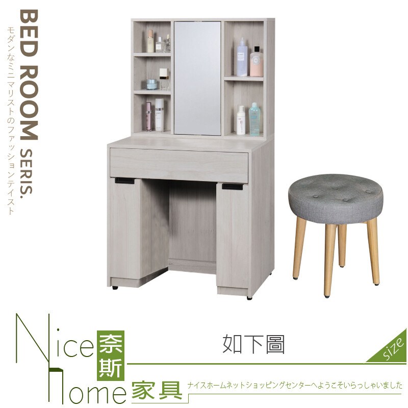 TEL: (02)2828-0860 手機 / Line ID:0905-423-752商品評價你可能也會喜歡【綠家居】福瑞 梣木紋2.7尺旋轉式鏡台/化妝台組合(含化妝椅)80305折1人購買12【綠家居】普蓋爾 現代3尺開合式鏡台/化妝台組合(含化妝椅+側邊櫃)117851人購買15《奈斯家具Nice》191-05-HV 秋風2.7尺化妝台/鏡台/含椅92160《奈斯家具Nice》160-05-HV 901胡仔色2.7尺鏡台/化妝台/含椅 (椅子有改款)104640《奈斯家具Nice》049-05-HDC 沃克2.7尺鏡台/化妝台/含椅122880《奈斯家具Nice》187-02-HV 艾斯白雪松2.7尺化妝台/鏡台/含椅97920《奈斯家具Nice》189-02-HV 布來恩淺灰橡2.7尺化妝台/鏡台/含椅97920《奈斯家具Nice》184-04-HV E05#淺灰橡2.7尺化妝台/鏡台/含椅95040《奈斯家具Nice》185-07-HV D05#白榆木2.7尺化妝台/鏡台/含椅95040《奈斯家具Nice》192-04-HV 雪冬2.7尺五斗櫃62400《奈斯家具Nice》153-03-HV 原切2.6尺鏡台/化妝台/含椅74880《奈斯家具Nice》155-03-HV 雪松2.6尺鏡台/化妝台/含椅74880《奈斯家具Nice》194-02-HV 愛麗絲2尺化妝台/鏡台/含椅57600《奈斯家具Nice》144-05-HM 約書亞2尺鏡台/化妝台/含椅64320《奈斯家具Nice》311-05-HJ 帕特3尺鏡台/化妝台/含椅119040《奈斯家具Nice》054-05-HDC 艾倫2尺鏡台/化妝台/含椅94080《奈斯家具Nice》081-05-HK 圓圓1.9尺化妝台/鏡台/含椅71040《奈斯家具Nice》178-01-HV 哈利3尺鏡台/化妝台/含椅83520《奈斯家具Nice》152-03-HV 灰橡2.6尺鏡台/化妝台/含椅74880