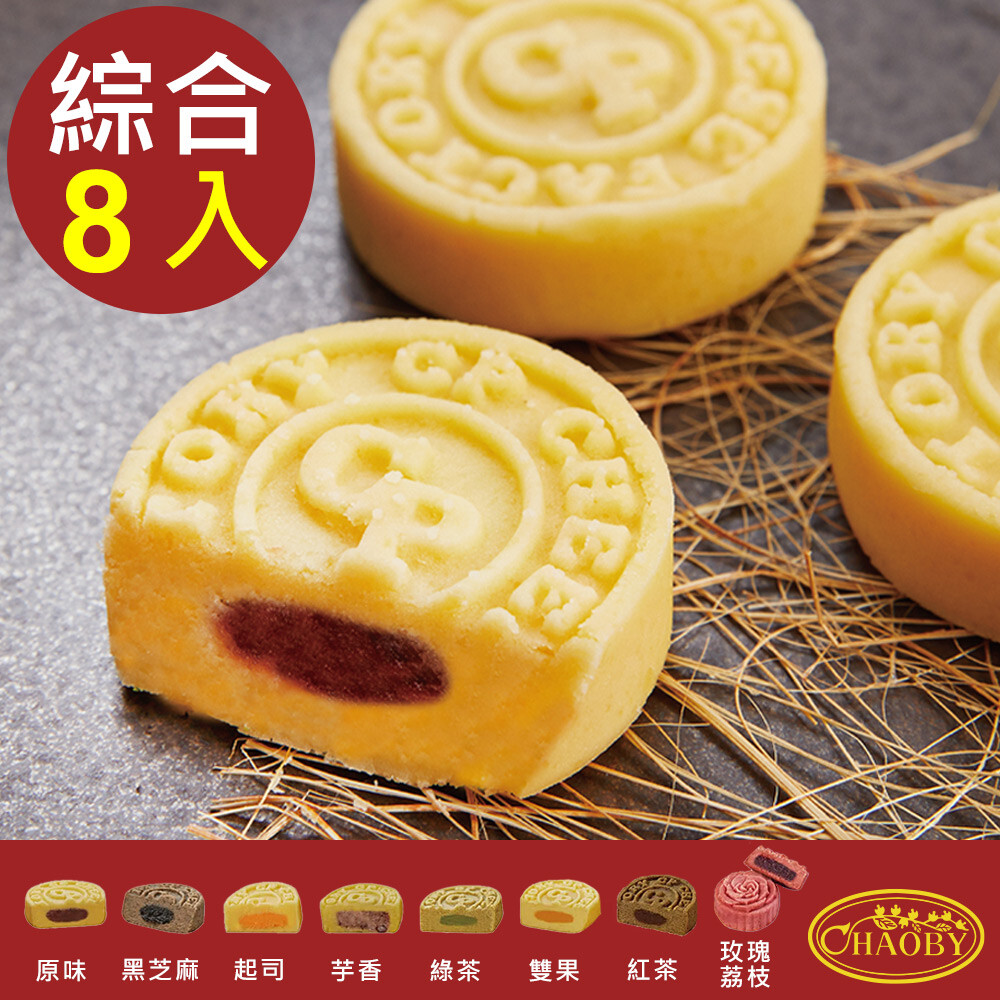 八種口味內含:原味、雙果、黑芝麻、紅茶、起司、芋香、綠茶、玫瑰荔枝各一個。