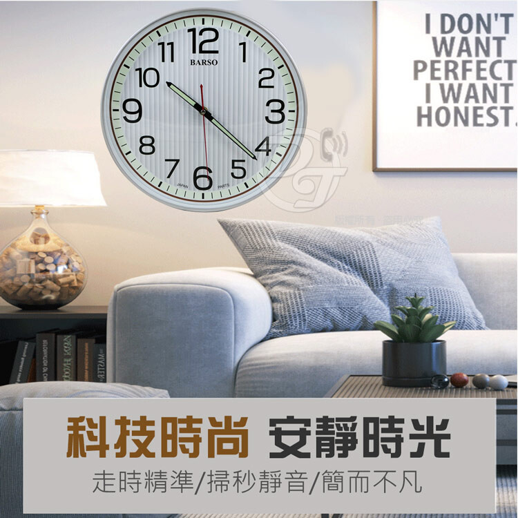 ◎品名:BARSO 亮銀の大字夜光靜音掛鐘 BS-802