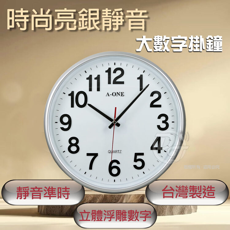 ◎品名:A-ONE金吉星 時尚亮銀靜音大數字掛鐘 TG-0236