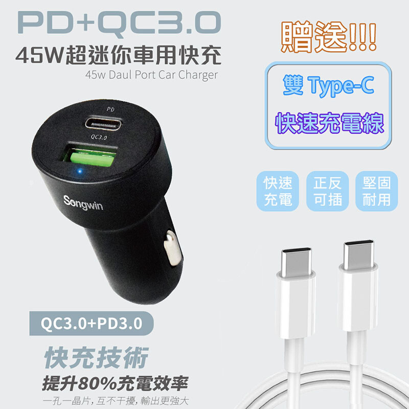 免運 Songwin 急速45W 超迷你快充PD+QC車載充電器/車充(附贈Type-C充電線)