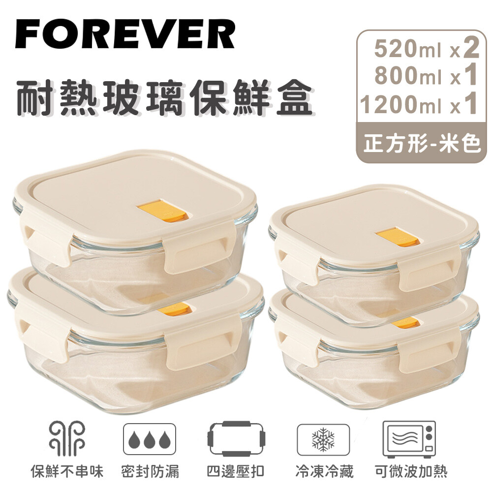 【日本FOREVER】耐熱玻璃保鮮盒4件組-正方形520ml+800ml+1200ml