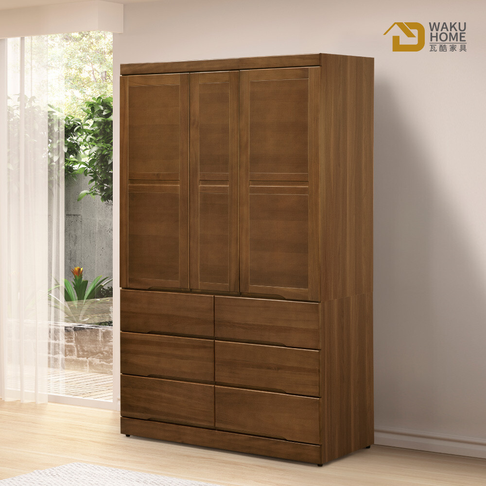 WAKUHOME 瓦酷家具Yamy淺胡桃實木4尺六抽衣櫃 (實木面板/檯面/座腳)A010-724