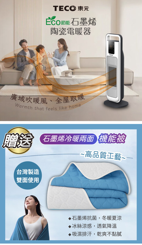 【TECO東元】ECO節能溫控石墨烯陶瓷電暖器/暖氣機/電暖爐(XYFYN3004CBW加贈石墨烯機
