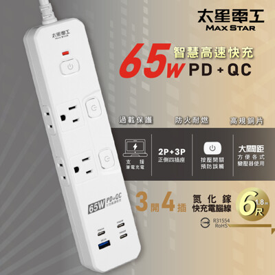 【太星電工】速充寶PD65W氮化鎵三開四插快充電腦線/2P+3P/6尺 OSA34306
