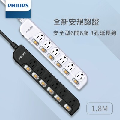 【PHILIPS飛利浦 阻燃防護延長線】6切6座 省電獨立開關 1.8M CHP3460