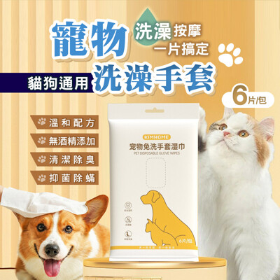 KIMHOME寵物手套濕巾1包6片(寵物洗澡 寵物乾洗澡 寵物清潔)