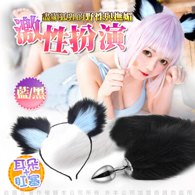 角色扮演 小狐狸 毛絨耳朵+不鏽鋼肛塞尾巴-黑藍
