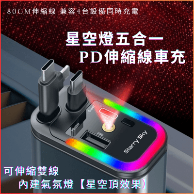 星空燈五合一PD伸縮線車充 檢驗合格 免運 USB伸縮線車充 車用充電器 雙TypeC 汽車點煙器