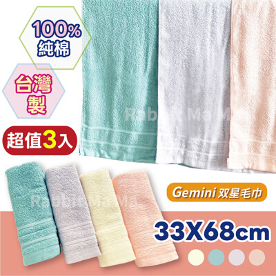 超值3入 台灣製純棉毛巾 抑菌吸水 171 Gemini雙星 33x68cm 輕薄快乾 双星毛巾