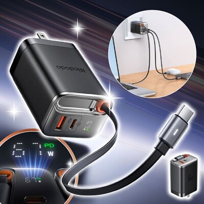 67W 數顯氮化鎵伸縮線充電器 三孔快充 自帶充電線 摺疊插腳 智慧功率顯示【178小舖】麥多多
