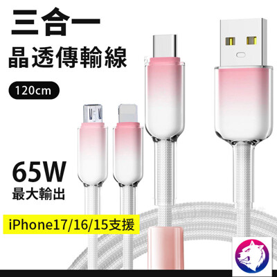 三合一晶透傳輸線 typec 充電線 傳輸線 typec充電線 65W 快充線 120cm